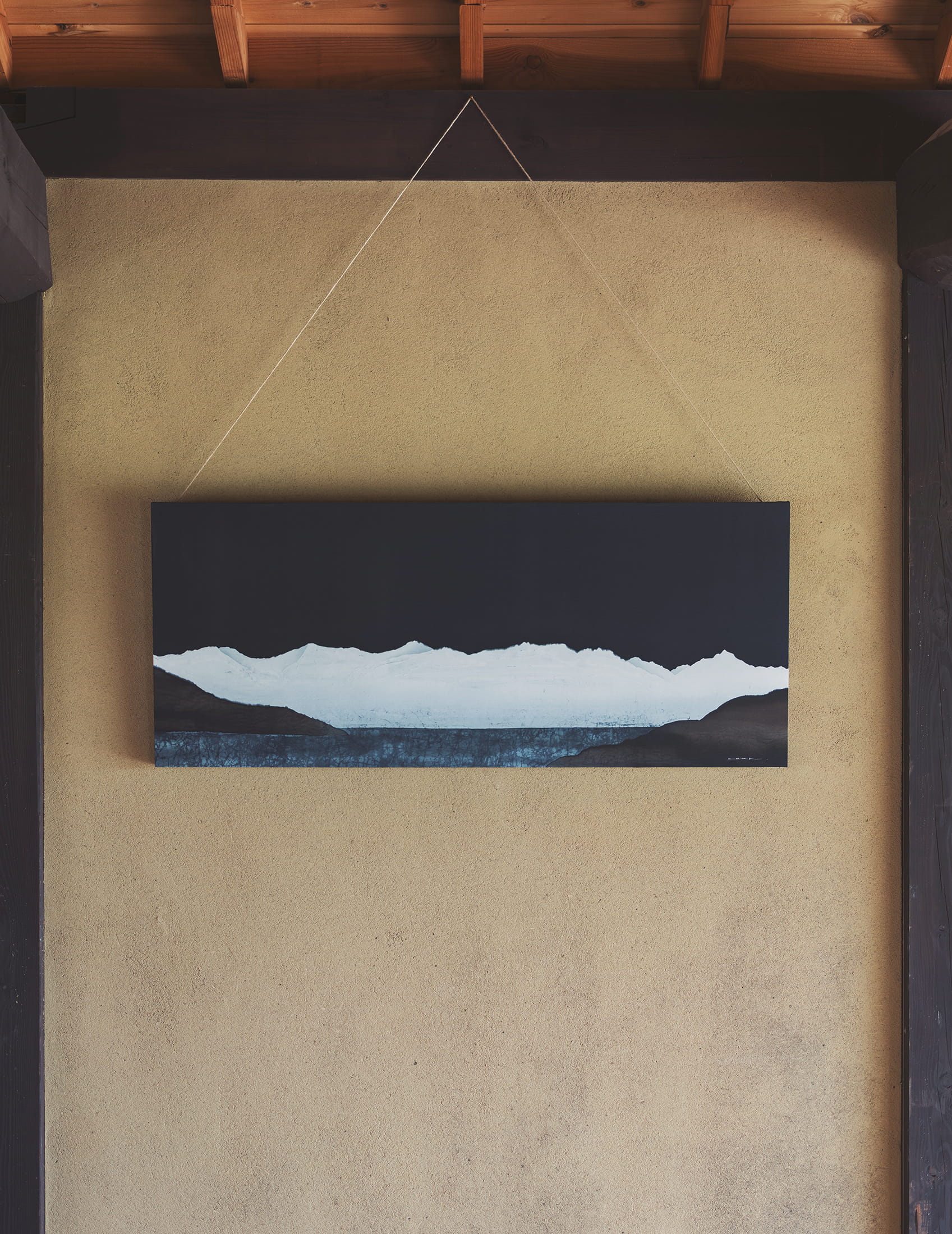 素朴屋のオフィスに飾られた古屋さんの臈纈染めの作品は、甲州市から望む南アルプス連峰を描いたもの。漆黒の空に白く浮かび上がる山並みは、その雄大さと高貴な姿で人々の暮らしを見守るように囲み、一つとなって崇高に鎮座し、古来より畏敬を抱かせる存在でした。荘厳さと静謐さを湛え、その下に広がる青は人々が暮らす街の盆地を象徴しています。